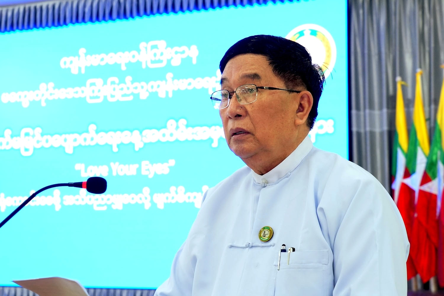 ဦးစွာ တိုင်းဒေသကြီးဝန်ကြီးချုပ် ဦးတင့်လွင်က နှစ်စဉ်အောက်တိုဘာလရဲ့ ဒုတိယအပတ်၊ ကြာသပတေးနေ့ကို ကမ္ဘာ့မျက်မမြင်ပပျောက်ရေးနေ့အဖြစ် သတ်မှတ်ပြီး ကမ္ဘာ့ကျန်းမာရေး အဖွဲ့ဝင် နိုင်ငံများမှာ နှစ်စဉ်ကျင်းပခဲ့ရာ မြန်မာနိုင်ငံတွင်လည်း သက္ကရာဇ်(၂၀၀၀) ပြည့်နှစ်မှစပြီး စတင် ကျင်းပခဲ့ကြောင်း၊ မျက်စိကွယ်ခြင်းနှင့် အမြင်အာရုံချို့ယွင်းခြင်းများဟာ ပြည်သူ့ကျန်းမာရေး ပြဿနာ တစ်ခုဖြစ်ကြောင်းကို သိရှိနားလည်ပြီး၊ ကျန်းမာရေးဝန်ကြီးဌာန အပါအဝင် အခြားနှီးနွယ် ဝန်ကြီးဌာနများ၊ တိုင်းဒေသကြီးနှင့် ပြည်နယ်အစိုးရအဖွဲ့များ၊ မိတ်ဖက်အဖွဲ့အစည်းများနှင့် စေတနာ့ ဝန်ထမ်းများ အားလုံးက ပြည်သူလူထုနှင့်အတူ တက်ညီလက်ညီပူးပေါင်းပြီး မျက်စိကျန်းမာရေး စောင့်ရှောက်မှု လုပ်ငန်းများကို အရှိန်အဟုန်မြှင့်ဆောင်ရွက်လာစေရန်နှင့် ကာကွယ်ကုသ၍ရသော မျက်စိရောဂါများကြောင့် အမြင်အာရုံချို့ယွင်းမှုနှင့် မျက်မမြင်ဖြစ်ပွားမှု လျော့နည်းပပျောက် သွားစေရန် ရည်ရွယ်ပါကြောင်း၊ ယခုနှစ် ကမ္ဘာ့မျက်မမြင်ပပျောက်ရေးနေ့ ဆောင်ပုဒ်ကတော့ “Love Your Eyes” “အမြင်အာရုံ ကောင်းစေဖို့ အသိပညာမျှဝေလို့ မျက်စိ ကျန်းမာရေး အလေးပေးစို့” ဖြစ်ပါကြောင်း၊ မျက်စိကျန်းမာရေး ဆိုင်ရာ ဗဟုသုတများ ရရှိလာစေရေးအတွက် အတွေ့အကြုံ များအား မျှဝေပေးခြင်းဖြင့် လူတစ်ဦး ချင်းစီတိုင်း အမြင်အာရုံကိုဦးစားပေး တန်ဖိုးထားတတ်ပြီး ပုံမှန်မျက်စိစစ်ဆေးခြင်း၊ ရောဂါရှာဖွေ ခြင်းများအား ပြုလုပ်လာစေရေး၊ မျက်စိကျန်းမာရေး စောင့်ရှောက်မှု လုပ်ငန်းများကို လူတိုင်းလက်လှမ်း မီစွာရရှိ ဆောင်ရွက်နိုင်စေရေး အတွက် ဝိုင်းဝန်း ပံ့ပိုးပေးကြရမှာ ဖြစ်ပါကြောင်း၊ မြန်မာနိုင်ငံသားအားလုံး ဘဝတစ်လျှောက် အမြင်အာရုံ ချို့ယွင်းမှု မရှိစေဖို့ရာအတွက် ငယ်စဉ် ကလေးအရွယ်ကစလို့ မျက်စိကျန်းမာရေးကို အလေးထားဆောင်ရွက် ကြဖို့ လိုအပ်ပါကြောင်းနှင့် တိုင်းဒေသကြီးကျန်းမာရေး ဦးစီးဌာနနဲ့အတူ နှီးနွယ်ဌာနများ၊ မိတ်ဖက် အဖွဲ့အစည်းများ၊ လူမှုရေး အသင်းအဖွဲ့များနှင့် ပြည်သူ အားလုံးပူးပေါင်း၍ မျက်စိကျန်းမာရေး စောင့်ရှောက်မှုလုပ်ငန်းများကို အရှိန်အဟုန်မြှင့် ဆောင်ရွက် သွားကြရန် တိုက်တွန်းပြောကြားသည်။