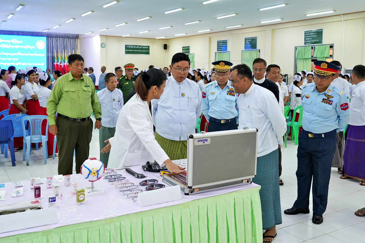 ဆက်လက်၍ တိုင်းဒေသကြီးဝန်ကြီးချုပ်နှင့် တာဝန်ရှိသူများသည် အထိမ်းအမှတ် အခမ်း အနားတွင် ခင်းကျင်းပြသထားသည့် ပြခန်းငယ်နှင့် ကမ္ဘာ့မျက်မမြင်ပပျောက်ရေးနေ့ အထိမ်းအမှတ် အဖြစ် မကွေးတိုင်းဒေသကြီး ပြည်သူ့ ကျန်းမာရေးနှင့် ကုသရေးဦးစီးဌာနမှ မကွေးပြည်သူ့ ဆေးရုံကြီး နှင့် မင်းဘူးပြည်သူ့ဆေးရုံကြီးတို့တွင် မျက်စိအတွင်းတိမ်လူနာ(၂၀)ဦးစီ အခမဲ့ ခွဲစိတ်ကုသပေး ဆောင်ရွက်မှုအား အားပေးကြည့်ရှုကာ၊ မျက်စိဝေဒနာရှင်များအား ထောက်ပံ့ငွေနှင့် မျက်မှန်များကို ပေးအပ်ခဲ့ ကြောင်း သိရသည်။