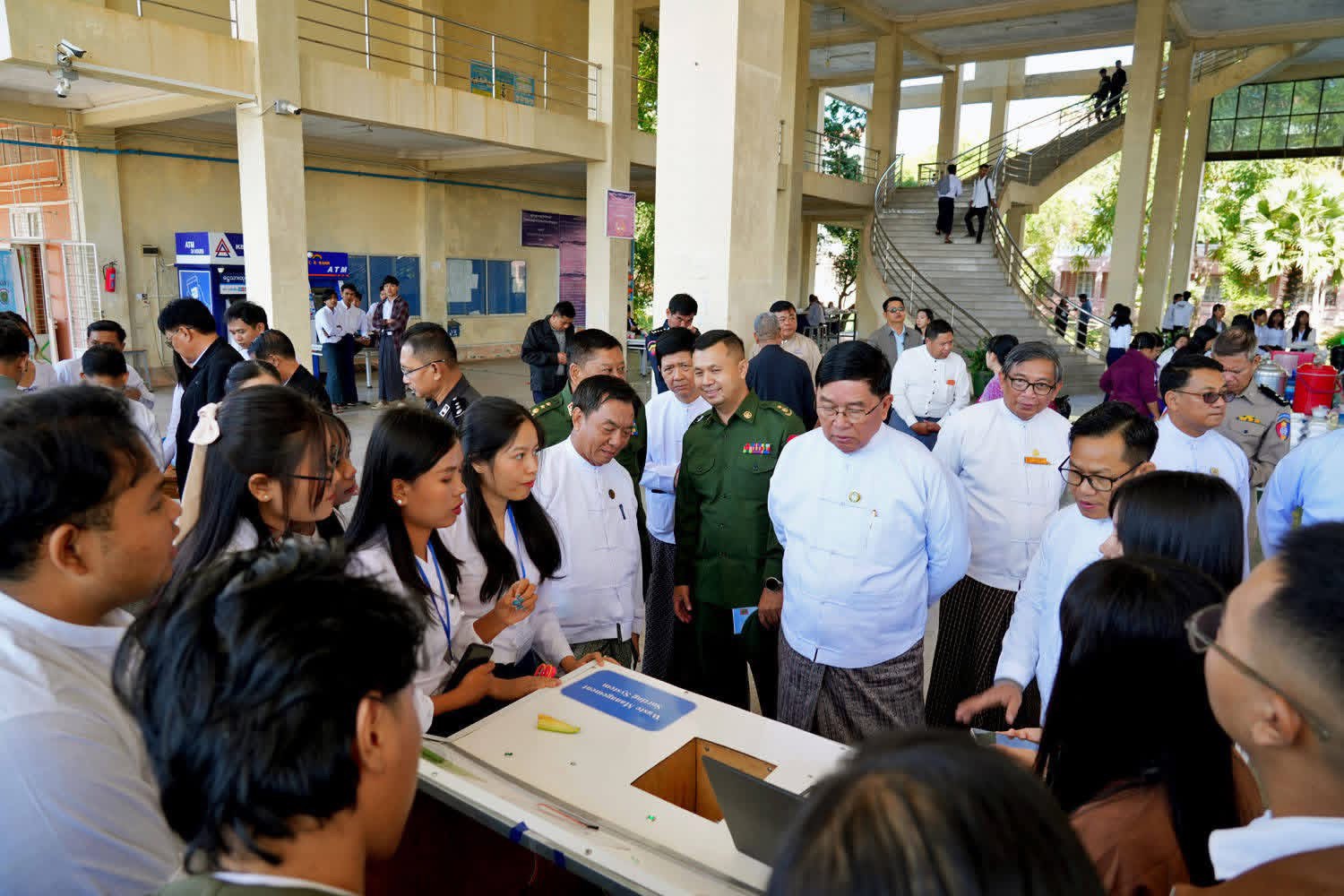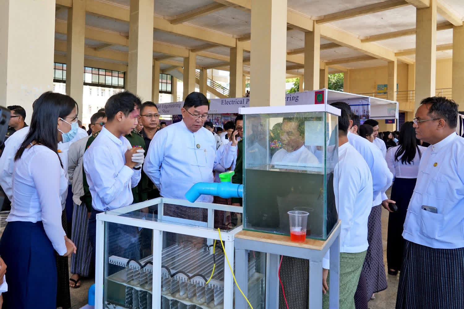ဦးစွာ မကွေးတိုင်းဒေသကြီးဝန်ကြီးချုပ် ဦးတင့်လွင်နှင့် ဇနီးတို့က တက္ကသိုလ်လော်ဘီတွင် နည်းပညာတက္ကသိုလ်(မကွေး) Science Competition and Fair, 2025 အထိမ်းအမှတ် အခမ်း အနားကို ကိတ်မုန့်လှီး၍ ဖွင့်လှစ်ခြင်း အစီအစဉ် ဆောင်ရွက်ပြီး၊ နည်းပညာတက္ကသိုလ်(မကွေး) Science Competition and Fair, 2025 အခမ်းအနားကို အဆိုပါ တက္ကသိုလ် ဘွဲ့နှင်းသဘင်ခန်းမ၌ ဆက်လက် ကျင်းပသည်။