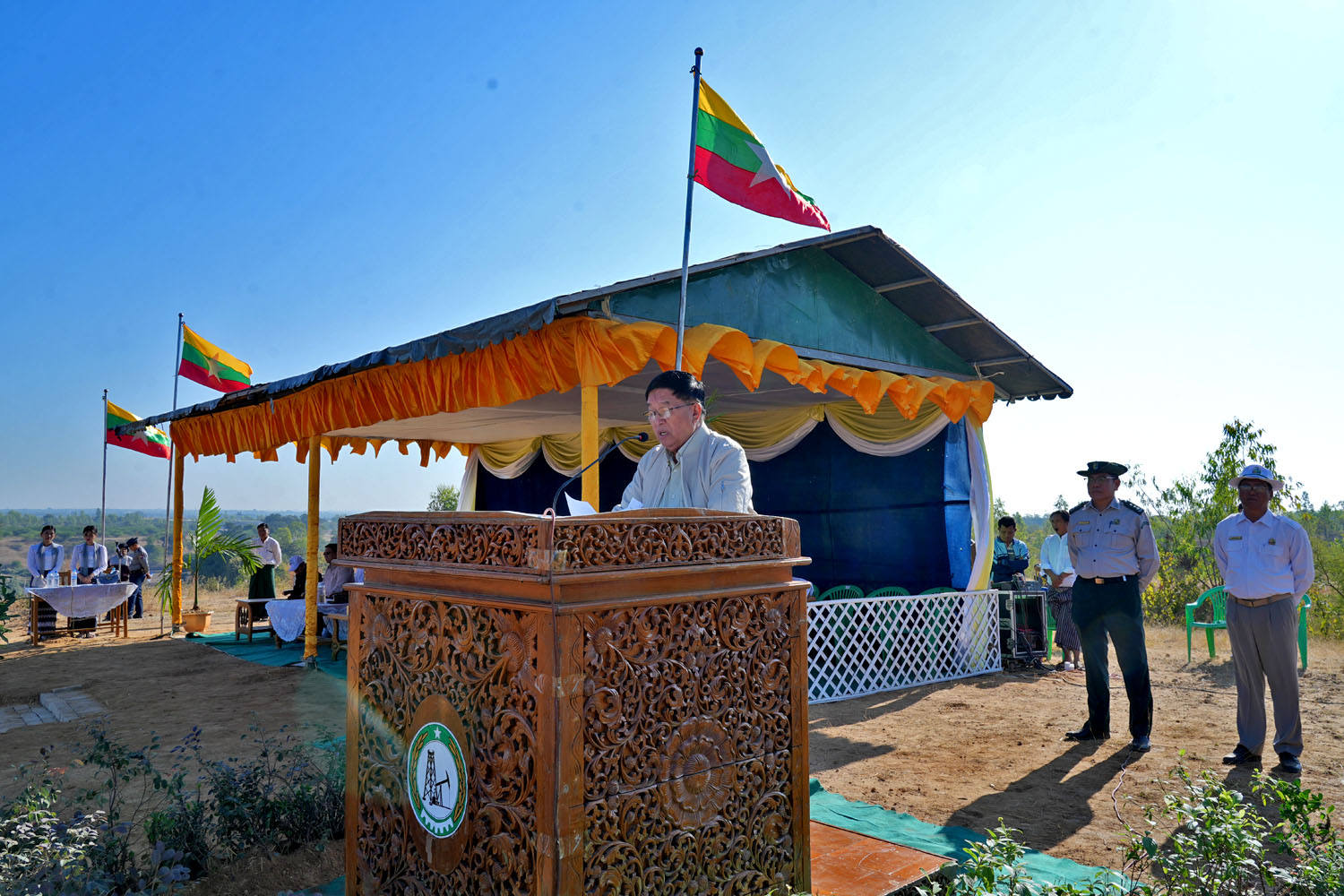 မိုးလွန်ကာလစုပေါင်းရေလောင်းပွဲတော် အခမ်းအနားတွင် မကွေးတိုင်းဒေသကြီးဝန်ကြီးချုပ် ဦးတင့်လွင် က မိမိတို့မကွေးတိုင်းဒေသကြီးအတွင်း ခရိုင်၊ မြို့နယ်အလိုက် လူထု လှုပ်ရှားမှုအသွင်ဖြင့် မိုးရာသီ သစ်ပင်စိုက်ပျိုးပွဲများ ကျင်းပခဲ့ပြီး စိုက်ပျိုးပြီးသစ်ပင်များအား မိုးရာသီအလွန် ပူပြင်းခြောက် သွေ့တဲ့ ရာသီဥတုကို ကာလရှည်ရင်ဆိုင်အံတုနိုင်ဖို့ ပြည်သူများပါဝင် စုပေါင်း၍ နွားချေးမြေဆွေး ထည့်ပြီး အမြစ်ဇုန်ထိရောက်အောင် ရေလောင်းခြင်း၊ ပေါင်းရှင်းခြင်း၊ ဓာတ်မြေဩဇာကျွေးခြင်း၊ သေပင်ဖာထေးခြင်း၊ မီးကာကွယ်ခြင်းလုပ်ငန်းများကို ရာသီအလိုက် လုပ်ဆောင်၍ မြဲအောင် ထိန်းသိမ်းရမှာဖြစ်ကြောင်း နိုင်ငံတစ်နိုင်ငံ ဖွံ့ဖြိုးတိုးတက်ရန် လိုအပ်ချက် များစွာရှိတဲ့အနက် ပတ်ဝန်းကျင် ထိန်းသိမ်းရေးသည် အဓိကကျကြောင်း သဘာဝပတ်ဝန်းကျင် ပျက်စီးသွားပါက စီးပွားရေး၊ လူမှုရေး ဖွံ့ဖြိုးတိုးတက်ရန် အလွန်ခဲယဉ်းသွားမှာဖြစ်သည့်အတွက် “နိုင်ငံတော်သာယာဖို့ သဘာဝပတ်ဝန်းကျင်ထိန်းကြစို့”ဟုသော ဆောင်ပုဒ်နှင့် အညီ စိုက်ပျိုးပြီးတဲ့ သစ်ပင်များကို တစ်ပင်စိုက်လျင် တစ်ပင်ရှင်သန်အောင်မြင်အောင် ပြုစုထိန်းသိမ်း၍ သဘာဝပတ်ဝန်းကျင်ကောင်း ရရှိရေးအတွက် သစ်တောသစ်ပင်များ စုပေါင်းရေလောင်းပြုစုပြီး ရေရှည်တည်တံ့အောင် မိမိတို့ ကျေးရွာ၊ ရပ်ကွက်၊ မြို့နယ်ပြည်သူများအနေဖြင့် အမျိုးသားရေး တာဝန် တစ်ရပ်အနေဖြင့် ဝိုင်းဝန်းထိန်းသိမ်း ပေးကြစေ လိုကြောင်း တိုက်တွန်းမှာကြားခဲ့သည်။