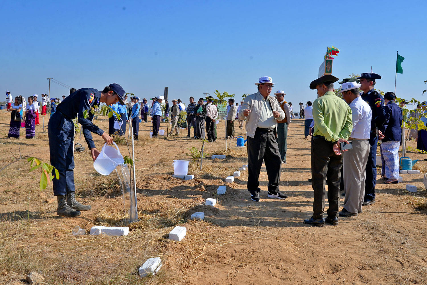 သစ်ပင်သစ်တောများသည် လူသားများအပါအဝင် သက်ရှိအားလုံး ရှင်သန်ရပ်တည် နေထိုင် နိုင်ရန် အရေးကြီးသည့် အခန်းကဏ္ဍတွင် ပါဝင်နေသည့်အတွက် သစ်ပင်သစ်တောများ မပြုန်းတီး စေရေးနှင့် သစ်တော၊ သစ်ပင်များ တိုးပွားရှင်သန်စေရန်ရည်ရွယ်၍ ၂၀၂၅ ခုနှစ်၊ မကွေးတိုင်း ဒေသကြီး၊ မကွေးမြို့နယ်၊ နံကပ်ကျွန်းကျေးရွာအုပ်စု၌ စိုက်ပျိုးခဲ့သည့် အရိပ်ရအပင်များနှင့် လေကာ တန်းပင်များ အား ရေလောင်းပြုစုခြင်း အခမ်းအနားကို ယနေ့နံနက် (၈)နာရီအချိန်က မကွေးမြို့၊ နံကပ်ကျွန်း ကျေးရွာအုပ်စု၌ ကျင်းပပြုလုပ်ရာ မကွေးတိုင်းဒေသကြီးဝန်ကြီးချုပ် ဦးတင့်လွင်၊ နယ်မြေခံ တပ်နယ်မှ တပ်မတော်အရာရှိများ၊ တိုင်းဒေသကြီးအစိုးရအဖွဲ့ဝင် ဝန်ကြီးများ၊ တိုင်း/ခရိုင်/ မြို့နယ်အဆင့်ဌာနဆိုင်ရာ တာဝန်ရှိသူများ၊ ကျောင်းသား/သူများ၊ ဒေသခံပြည်သူများ၊ လူမှုရေး အသင်းအဖွဲ့များ တက်ရောက်ခဲ့ကြသည်။