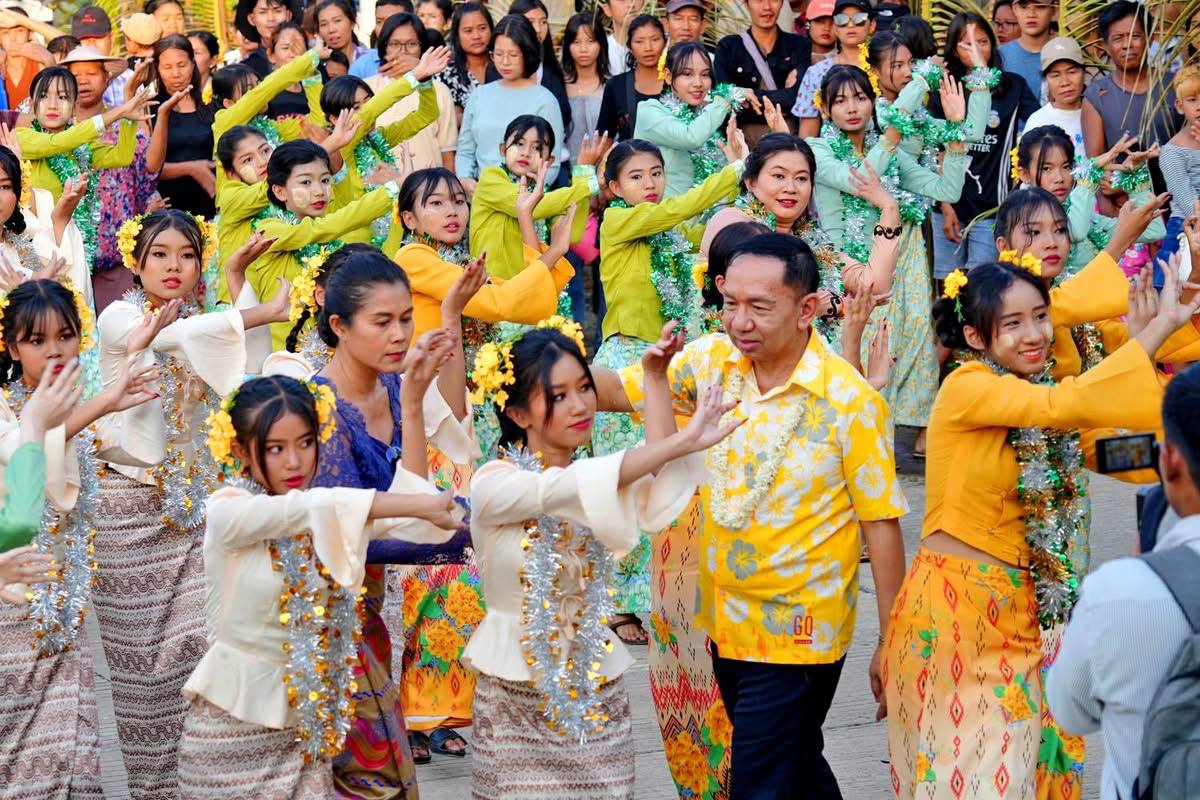 ဆက်လက်ပြီး နိုင်ငံကျော်တေးသံရှင်များ၊ ပြိုင်ပွဲဝင်ယိမ်းအဖွဲ့များနှင့် ဖျော်ဖြေရေး အဖွဲ့များမှ “မြူမှောင်ဝေကင်း၊ မန်းတောင်ရိပ်ခို” စသည့် သင်္ကြန်တေးသီးချင်းများဖြင့် သီဆိုကပြ ဖျော်ဖြေ တင်ဆက်ခဲ့ပြီးနောက် တိုင်းဒေသကြီးဝန်ကြီးချုပ်နှင့် တာဝန်ရှိသူများက ပြိုင်ပွဲဝင်ယိမ်းအဖွဲ့ များအား အတာရေဖြင့် ပက်ဖျန်းပြီး၊ ဂုဏ်ပြုဆုတော်ငွေများ ပေးအပ်ကာ လမ်းလျှောက်သင်္ကြန် မဏ္ဍပ်အတွင်း ဒေသခံပြည်သူများက စည်ကားသိုက်မြိုက် အေးချမ်းပျော်ရွှင်စွာဖြင့် ပါဝင်ဆင်နွှဲနေမှုများကို ကြည့်ရှု အားပေးခဲ့သည်။