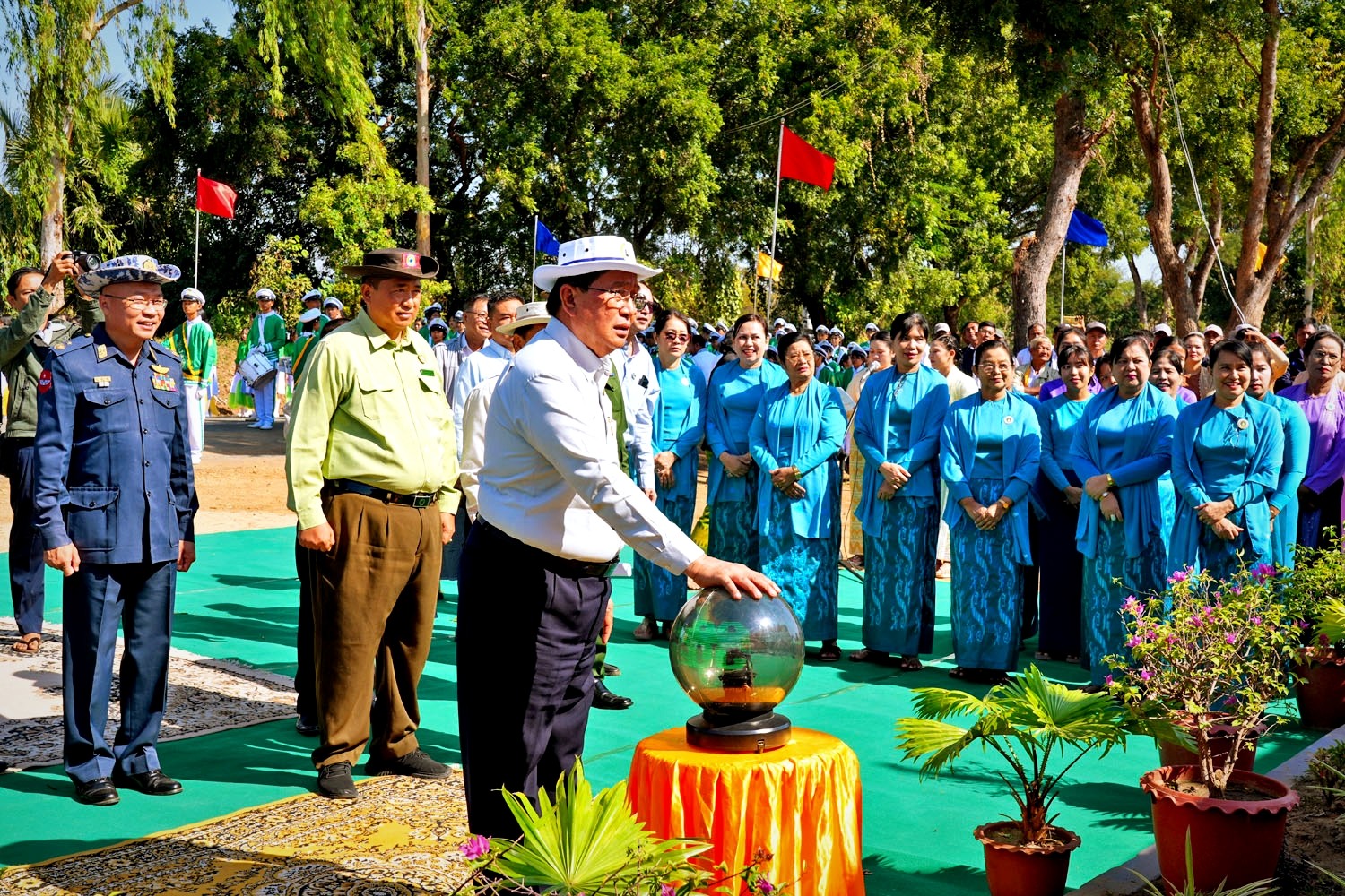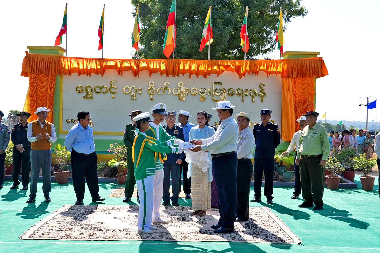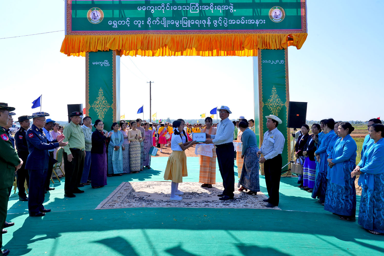 ဆက်လက်၍ အစီအစဉ် ဒုတိယပိုင်းကို ကျင်းပရာ “ ရွှေတင့်တူး” စိုက်ပျိုးမွှေးမြူ ရေးဇုန် မုဒ်ဦးကို တိုင်းဒေသကြီးဝန်ကြီးချုပ်နှင့် တာဝန်ရှိသူများက ဖဲကြိုးဖြတ်ဖွင့်လှစ်ပေးခဲ့ပြီး ဝန်ကြီးချုပ် က ဘင်ခရာနှင့် ပန်းပွားအဖွဲ့များအား ဂုဏ်ပြုဆုငွေများ ပေးအပ်ချီးမြှင့်ခဲ့သည်။